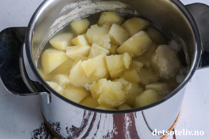 Fyll opp kjelen med vann så vannet dekker potetene godt (ikke ha salt i vannet). Kok potetbitene til de er helt møre.