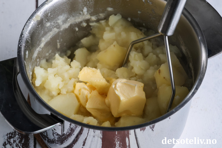 Mos de varme potetbitene med en potetstamper. Ha først i smøret i kjelen, og bruk potetstamperen til å mose smøret jevnt inn i den varme potetmosen ettersom det smelter.