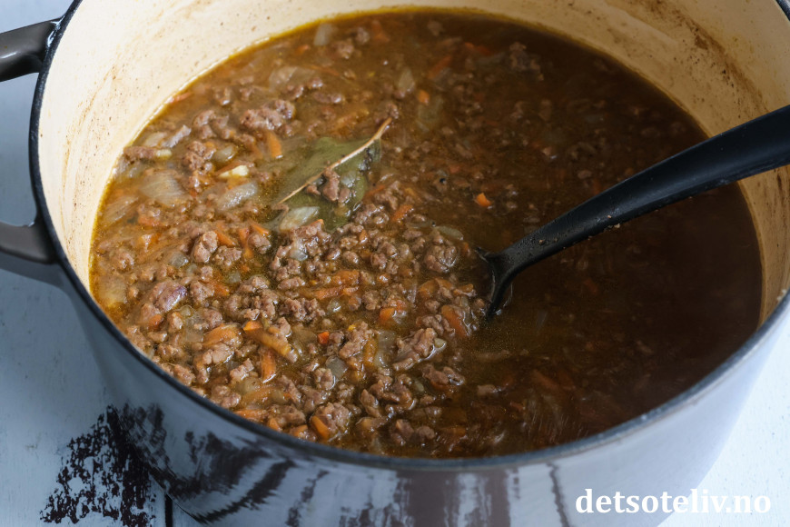 Tilsett revne gulrøtter, kjøttkraft (jeg bruker her 3 fond du chef, kjøtt til 8 dl vann), laurbærblad og worcestersaus. Kvern over salt og pepper. La dette småkoke under lokk i ca. 30 minutter.