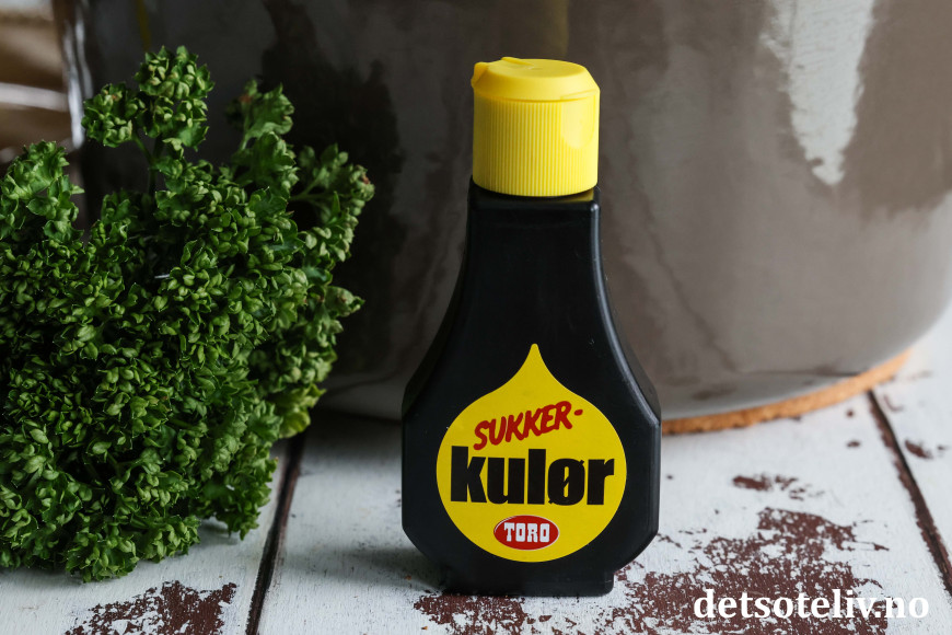 Tilsett litt sukkerkulør for å gi gryten en litt mørkere farge.