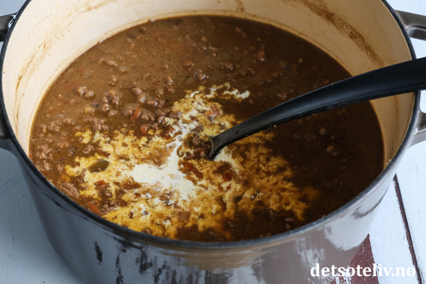 Løs opp maisenna i litt vann og ha dette i gryten i en tynne stråle. Gi gryten et nytt oppkok mens du rører (dette vil gjøre gryten litt fyldigere).