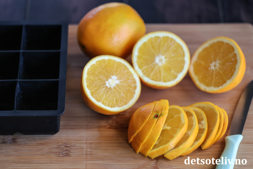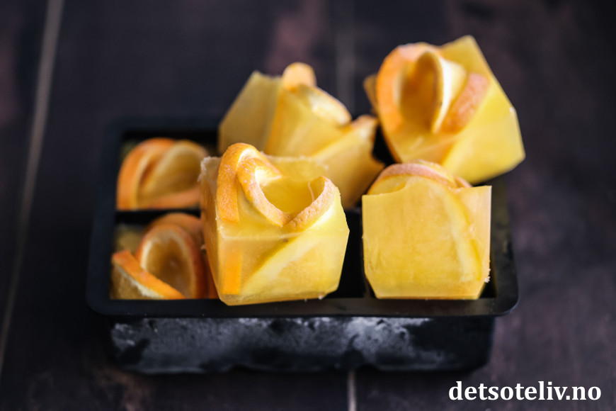 ♥ Isbitformen bør være firkantet og av den litt store varianten for at du skal få plass til appelsinskivene.