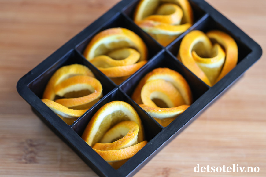 Når isbitene er frosne, er det bare å trykke ut appelsinrosene.