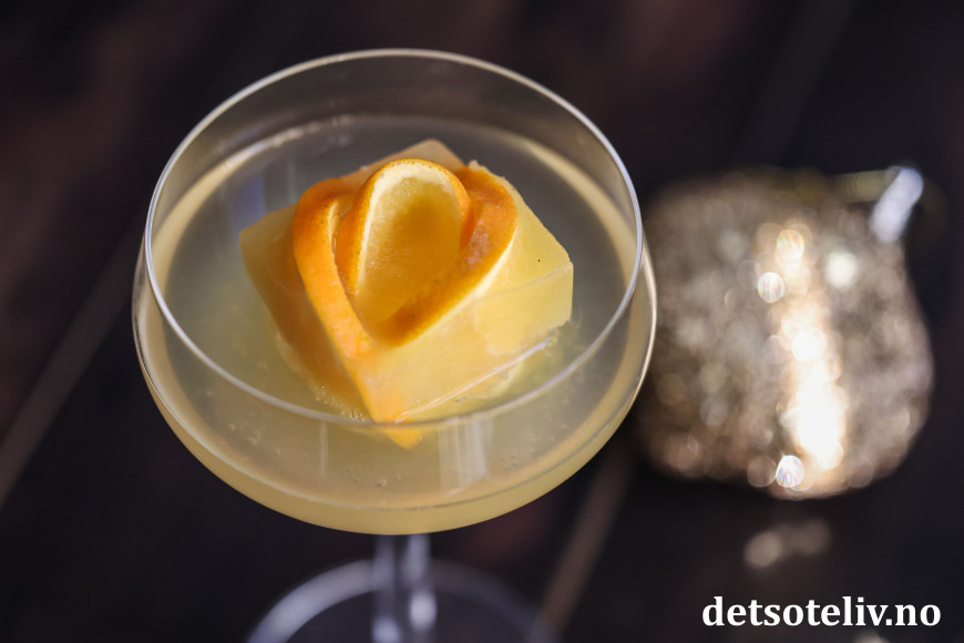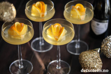 Ved servering has de frosne appelsinisbitene i hvert sitt champagneglass.