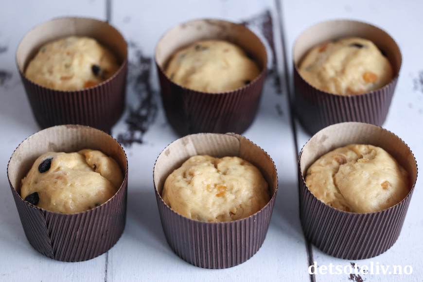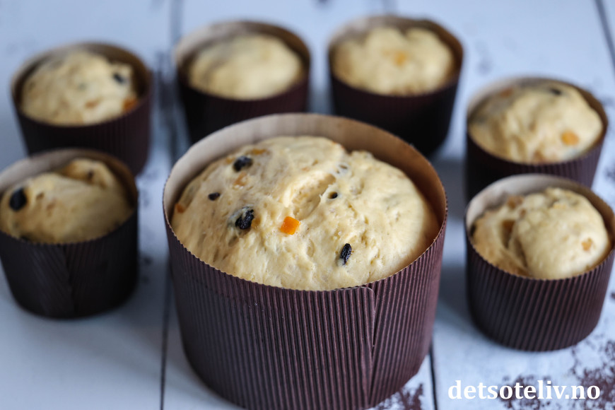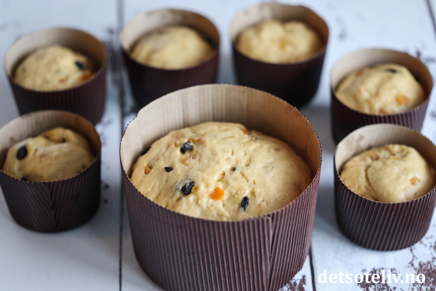 Kna deigen sammen og del den opp i emner. Rull emnene til boller og ha dem i panettoneformer. Formene skal bli omtrent halvfulle. Jeg lagde 6 mini-panettone som var 7 cm i diameter og 1 mellomstor panettone som var 13 cm i diameter.