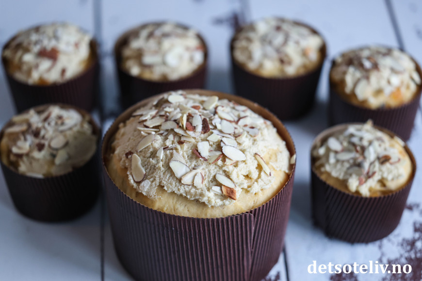 Jeg har tidligere laget en klassisk, stor Panettone som du finner oppskrift på HER. Den oppskriften er så god så jeg har brukt den samme denne gangen, men jeg har i tillegg toppet deigen med en mandelkrem som smelter inn i deigen og gir den en ekstra deilig overflate. Jeg har dessuten fordelt deigen i flere, mindre former.