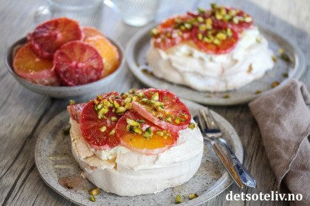 Legg dem på hvite pavlovabunner med fløtekrem, og pynt med grønne pistasjnøtter, slik at fargene virkelig kommer til sin rett.