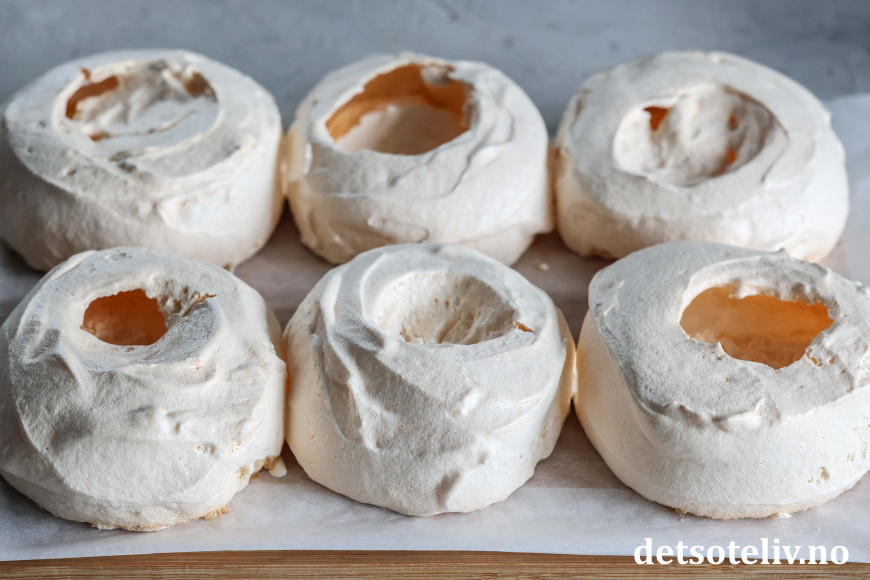 Form 6 små marengskaker på bakekpapirdekket stekeplate. Lag en liten grop i midten av kakene. Du kan bruke kniv til å forme marengskakene eller bruke kakesprøyte.