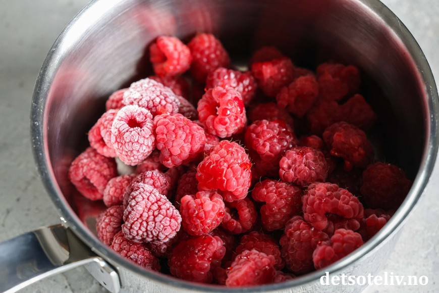 Til bringebærkremen har du først bringebær i en kjele. Det går like fint å bruke frosne eller friske bringebær (jeg brukte her en kombinasjon).