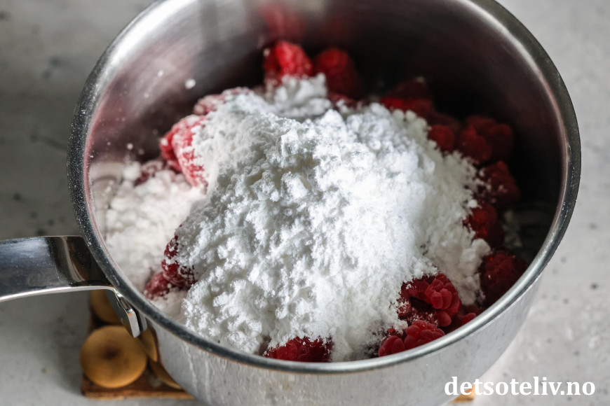 Til bringebærkremen har du først bringebær i en kjele. Det går like fint å bruke frosne eller friske bringebær (jeg brukte her en kombinasjon). Ikke ha noe vann i kjelen, for da blir bringebærkremen for tynn. Det er kun væsken fra bringebærene som skal brukes. Hvis du bruker frosne bringebær, kan du gjerne la dem ligge og tine litt i kjelen først. Dersom du bruker friske bringebær, kan du mose dem lett med en gaffel slik at de avgir noe væske.