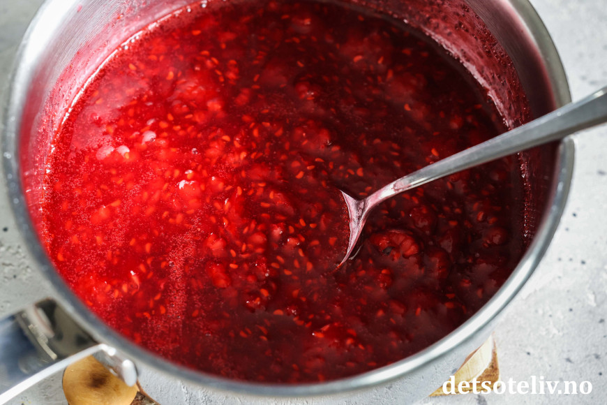 Varm opp på middels varme. Rør av og til. Etter hvert vil du se at bringebærene går i oppløsning. Rør blandingen jevn.
