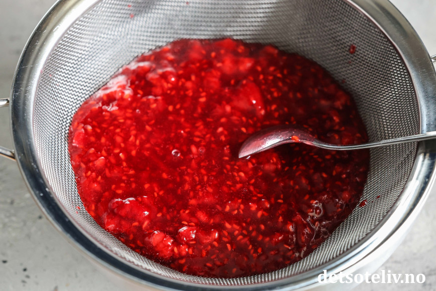 Sil bringebærsausen slik at du får fjernet frøene fra bringebærene.