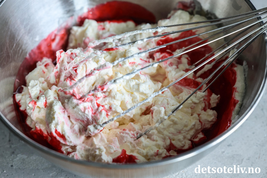 Pisk kremfløten til fast krem. Vend den kalde bringebærsausen inn i kremen. Du vil dermed få en deilig bringebærkrem med herlig rosafarge! 😍