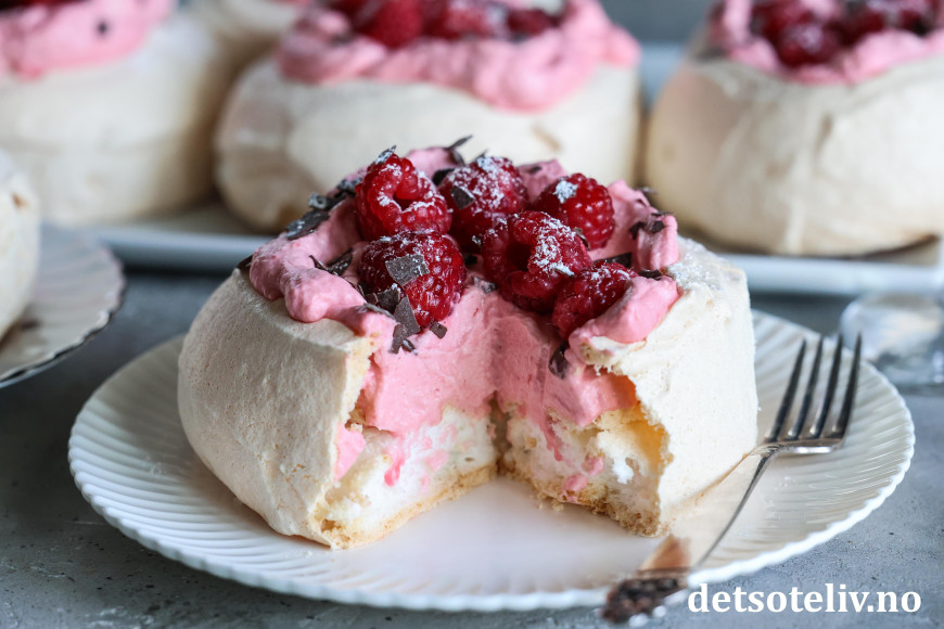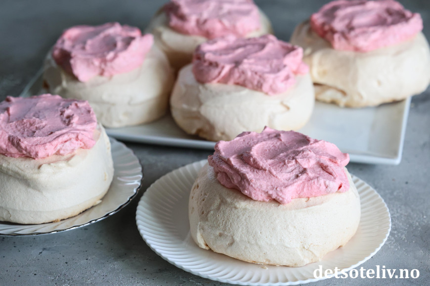 ♥ I stedet for porsjonskaker, kan du lage en stor rund Pavlova eller en Pavlovakrans. Øk da steketiden fra 30 minutter til 1 time, og la marengskaken deretter stå i ovnen til den har blitt kald.
