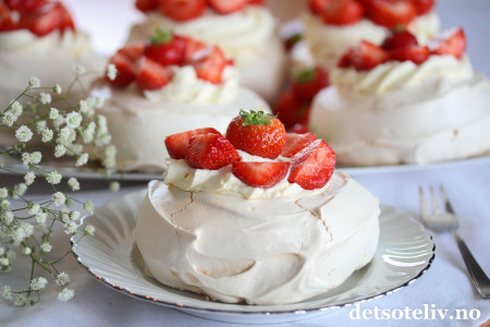 Form 6 små marengskaker på bakekpapirdekket stekeplate. Lag en liten grop i midten av kakene.