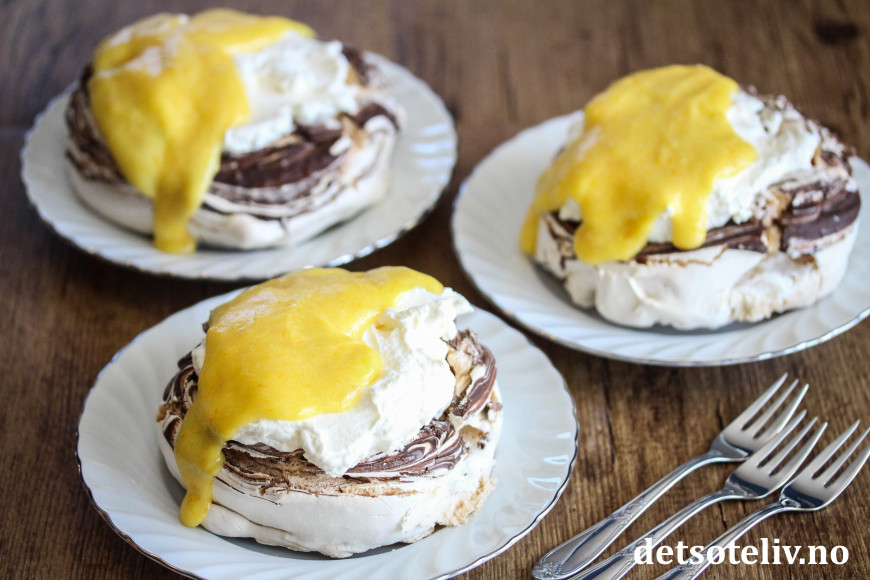 ♥ Som sagt går det fint å lage både marengskakene og appelsinkremen klar flere dager før servering. Du bør imidlertid fylle og pynte kakene på serveringsdagen. Husk at kakene bør stå kjølig frem til servering så kremen smaker helt fersk.