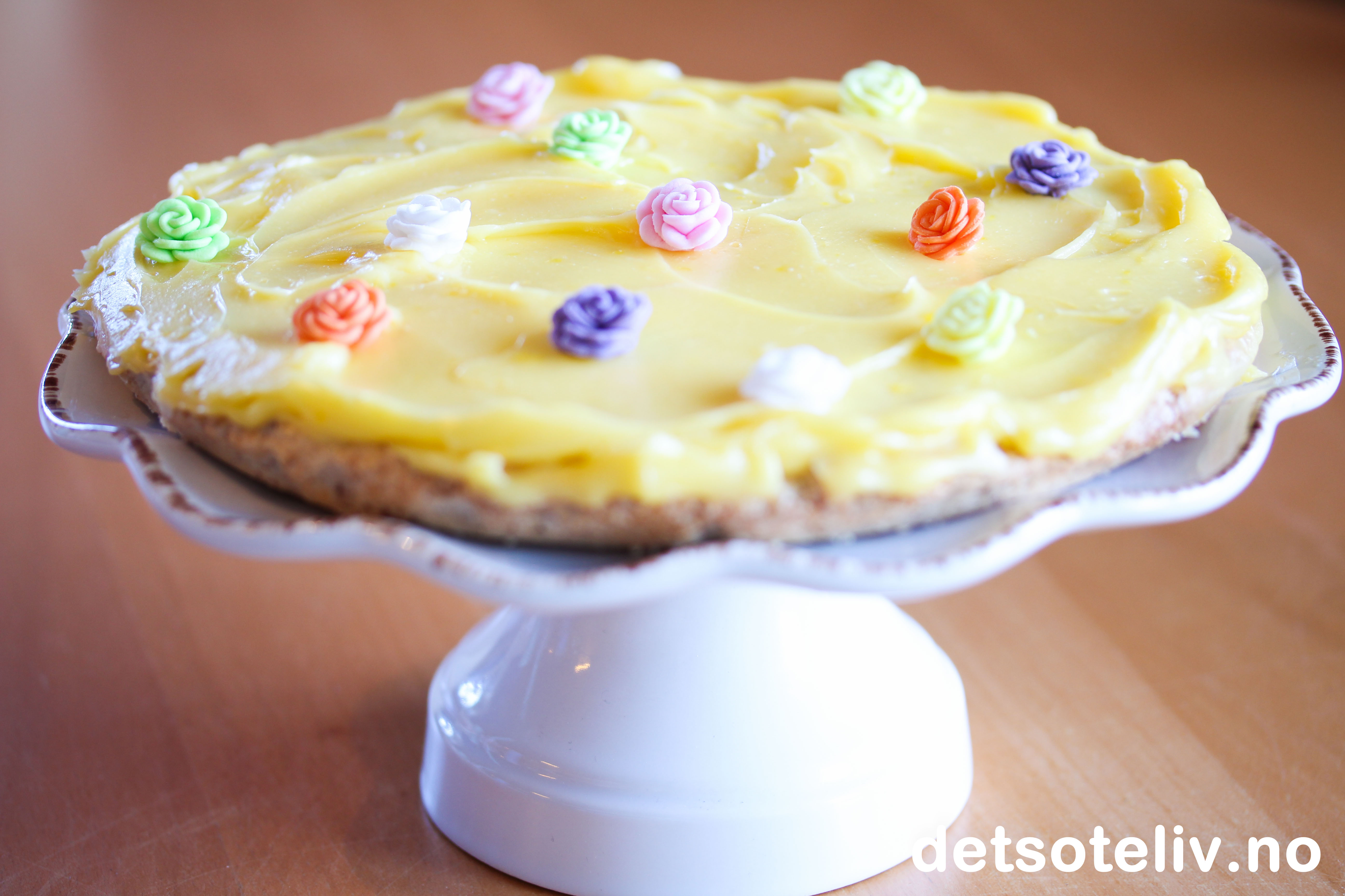 Ta kaken ut av formen og fjern bakepapiret. Sett kaken på et lite kakefat. Smør over den gule kremen.