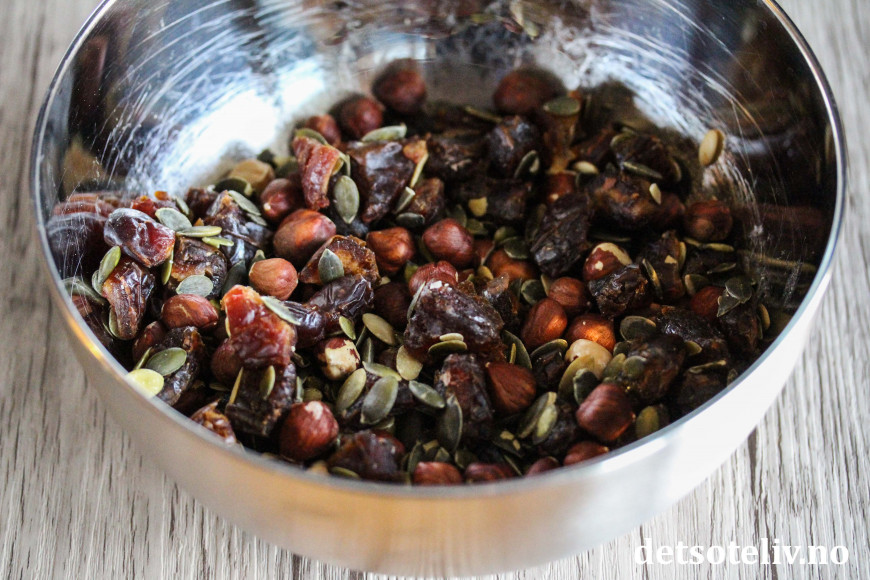 Del dadler i mindre biter. Hasselnøttene og gresskarkjerner kan gjerne beholdes hele. Bland sammen.