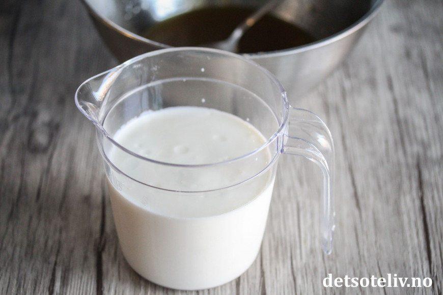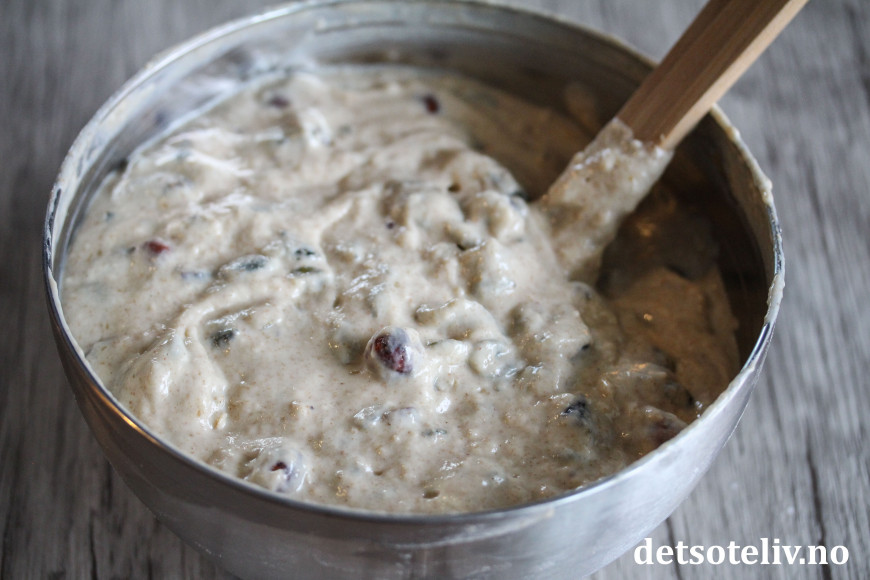 Ha både honningvannet og surmelken i bollen med det tørre. Rør forsiktig rundt med en slikkepott til deigen samler seg (ikke rør mer enn nødvendig).