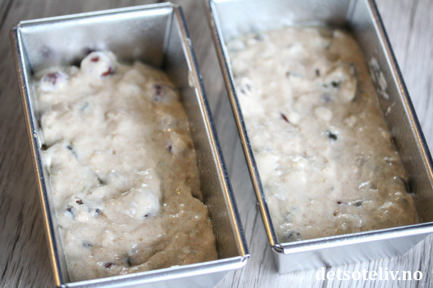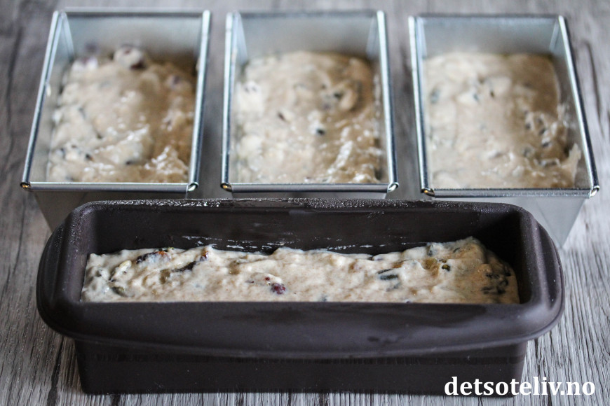 Fordel deigen i brødformer. Bruk helst ekstra små, avlange former (se tips), men det går også fint med 2 vanlige, små brødformer som rommer 1 liter hver.