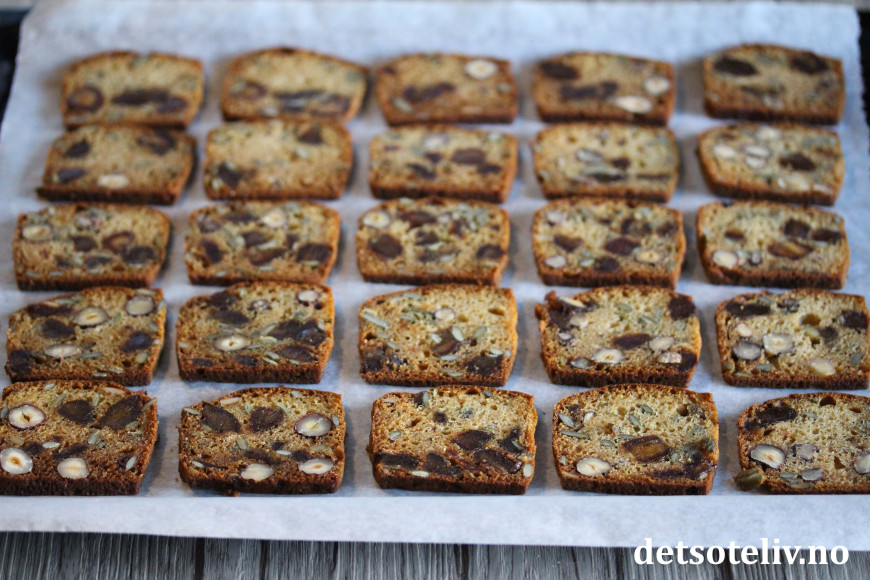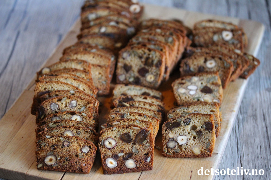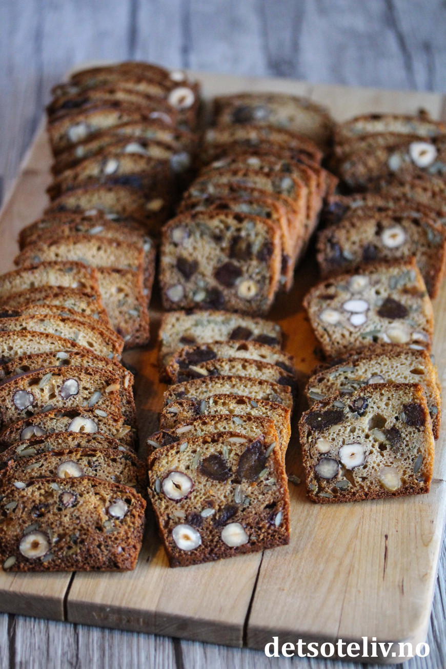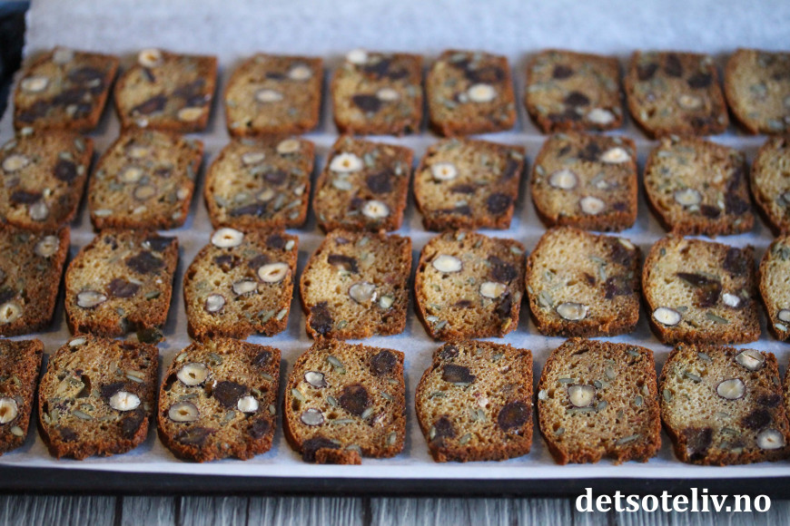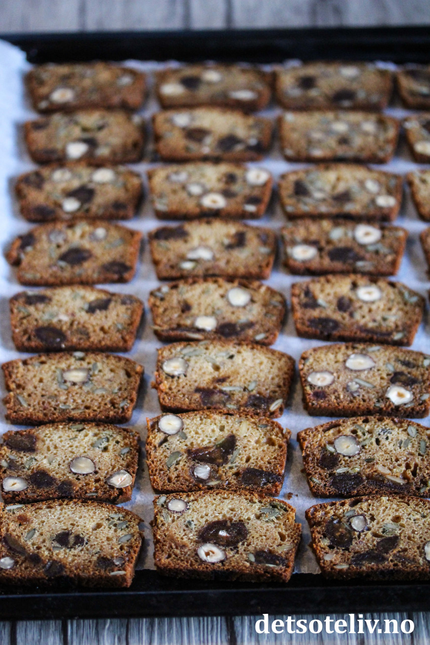 Her kommer en ny favorittoppskrift på sprø Minitoast med dadler, hasselnøtter og gresskarkjerner. Kjeksene stekes som brød, som så fryses og så skjæres i tynne skiver. Skivene tørkes i ovnen til de blir knasende sprø.