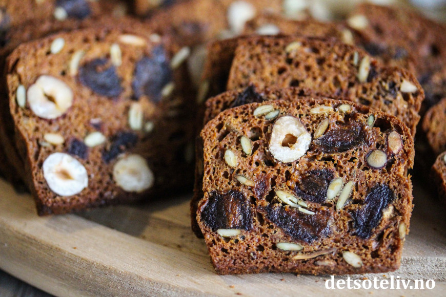 Del dadler i mindre biter. Hasselnøttene og gresskarkjerner kan gjerne beholdes hele. Bland sammen. Vend dette inn i deigen.
