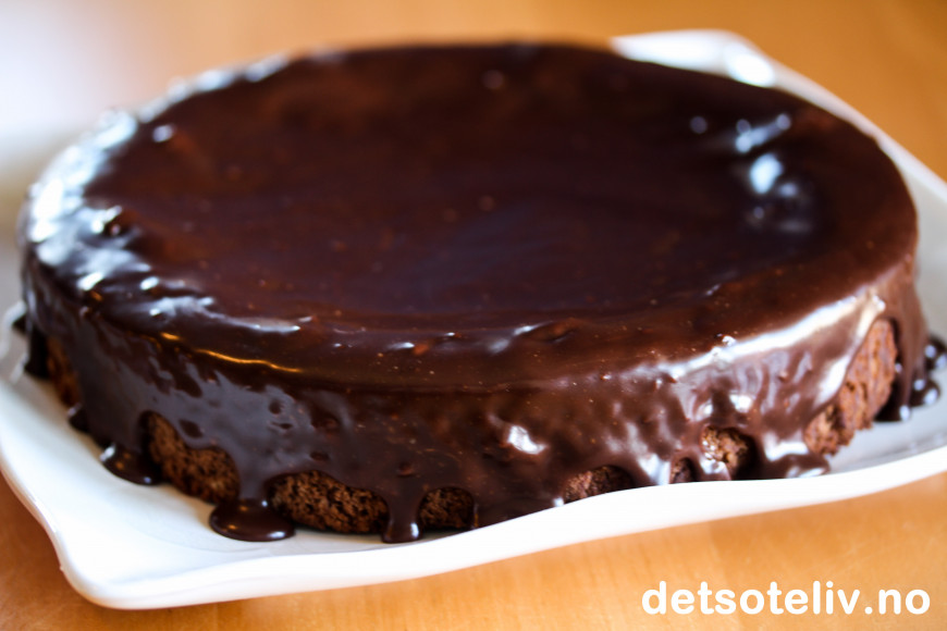 ♥ Jeg har doblet porsjonen med glasur, fordi jeg synes det er greit å ha rikelig av den Det går imidlertid også an å smelte kun 100 g sjokolade i 1/2 dl kokende fløte og smøre et tynt lag glasur over kaken.