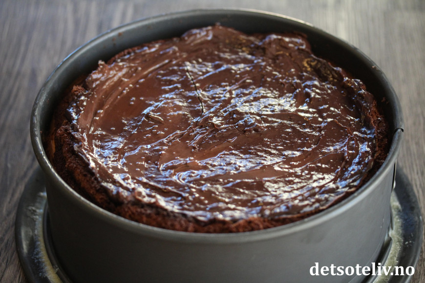 La kaken bli helt kald i formen, gjerne i kjøleskapet over natten. Kaken skal bli helt fast og stiv før du heller på sjokoladepuddingen.