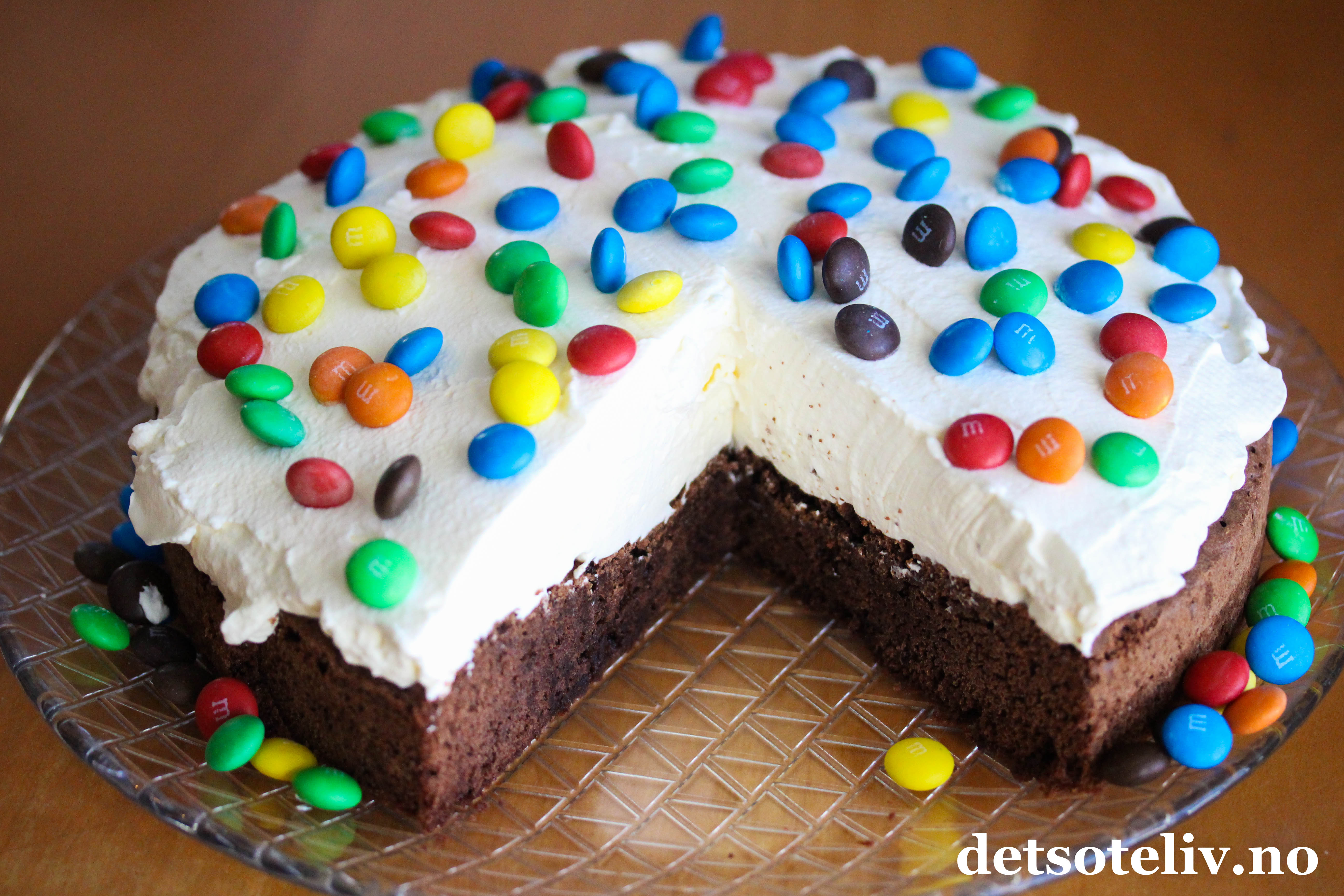 Pisk kremfløte og vaniljesukker til krem. Fordel kremen over sjokoladekaken. Pynt med M&M's rett før servering.
