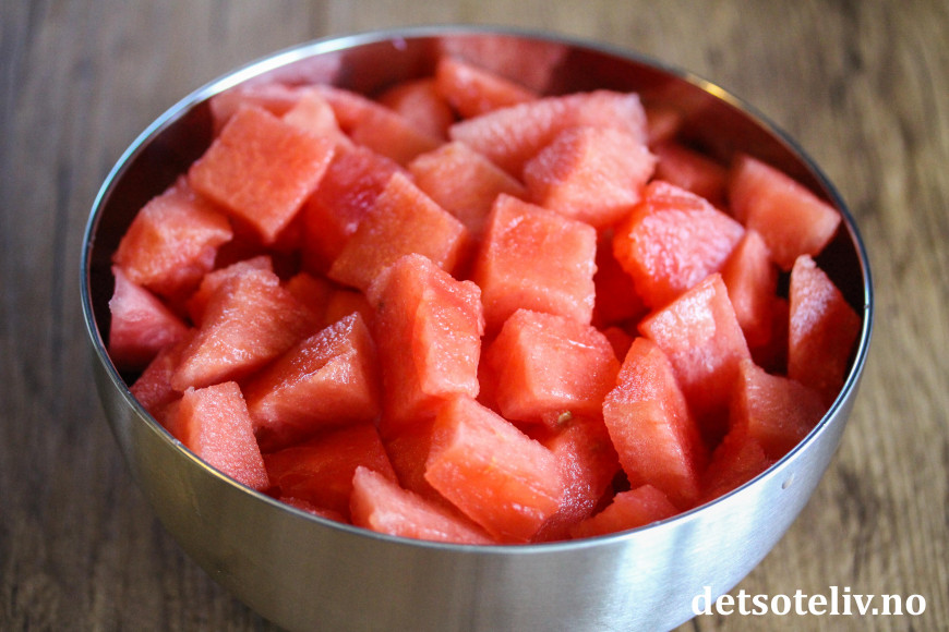 Rens vannmelon og del fruktkjøttet i terninger. Sett gjerne bollen med vannmelonbitene i fryseren i et par timer, så blir drinken skikkelig fyldig og kald!