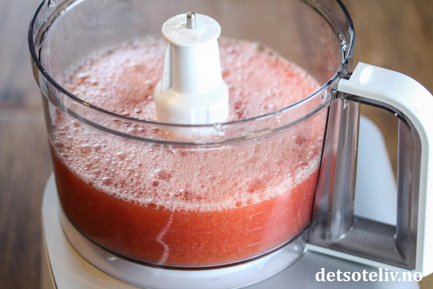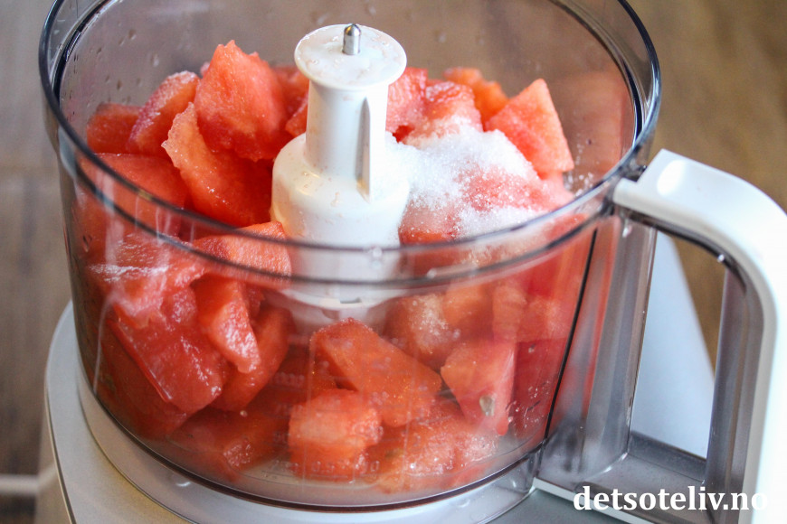 Ha de kalde vannmelonbitene i en food processor sammen med sukker, presset limesaft og kullsyreholdig vann.
