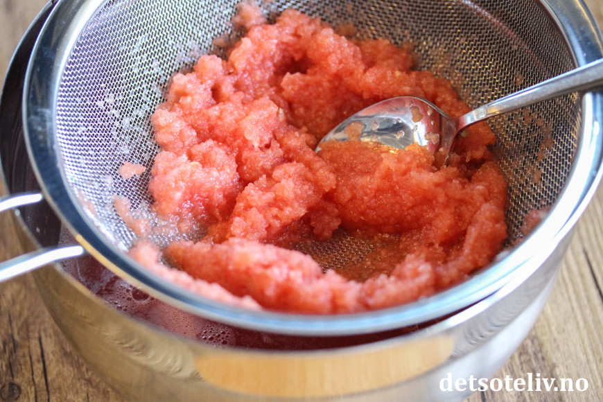 Sil blandingen så fruktkjøttet og eventuelle småsteiner fjernes.