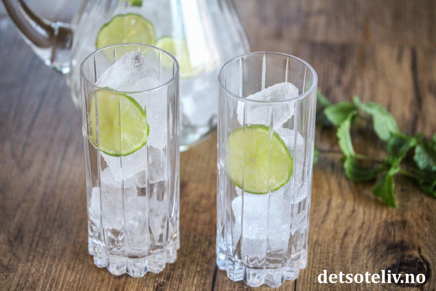 Fyll opp en vannkanne og høye glass med isbiter. Legg i noen skiver med lime.