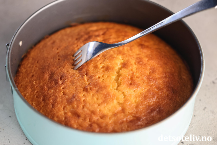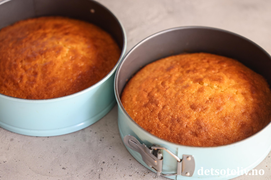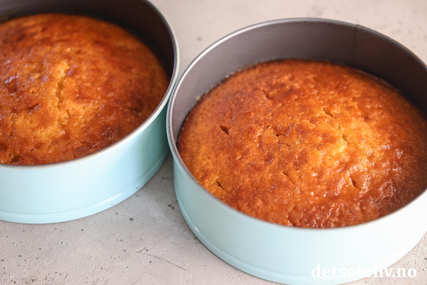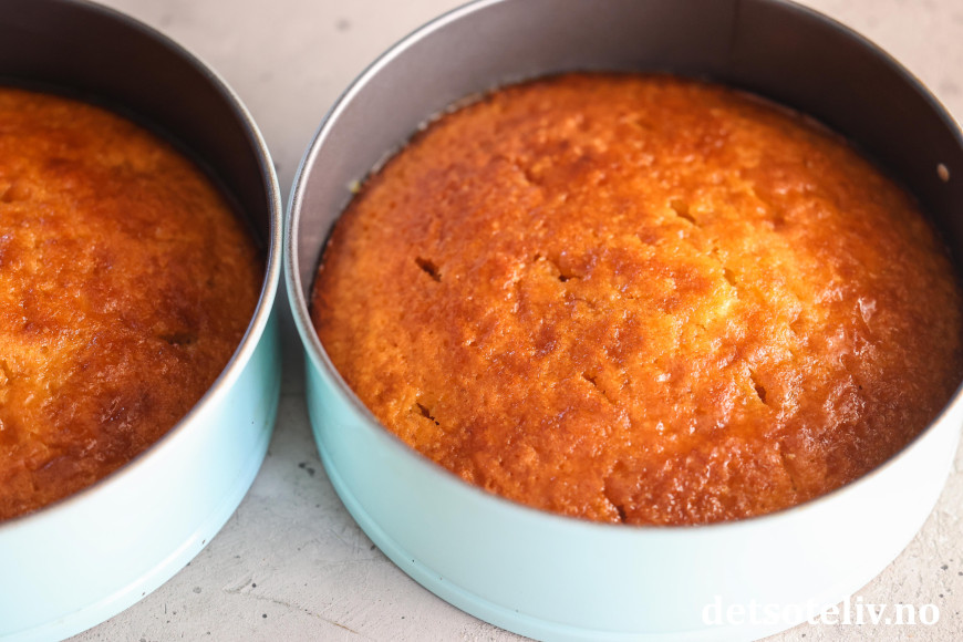 Fordel deigen i 2 små, runde former (20 cm i diameter) med bakepapir i bunnen. Stek kakene midt i ovnen ved 180°C i ca. 30 minutter, til de er gjennomstekte.