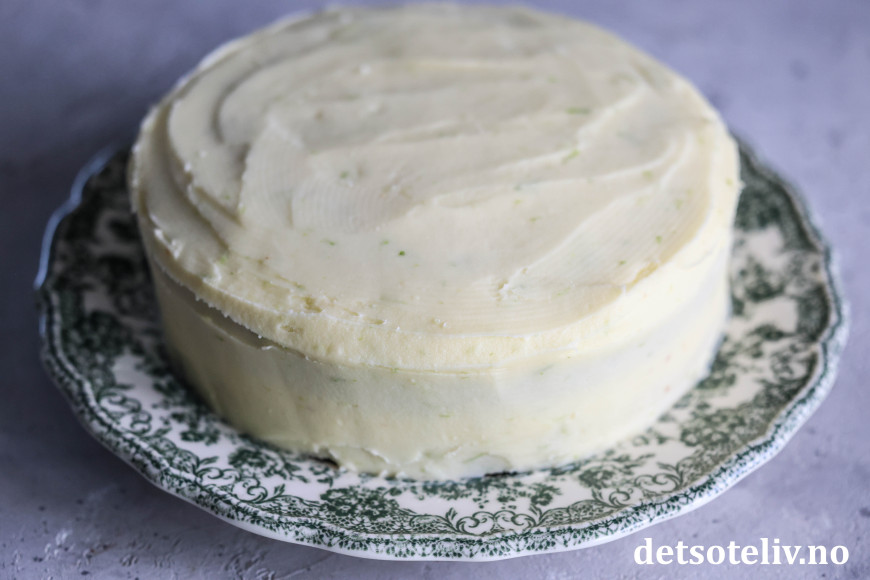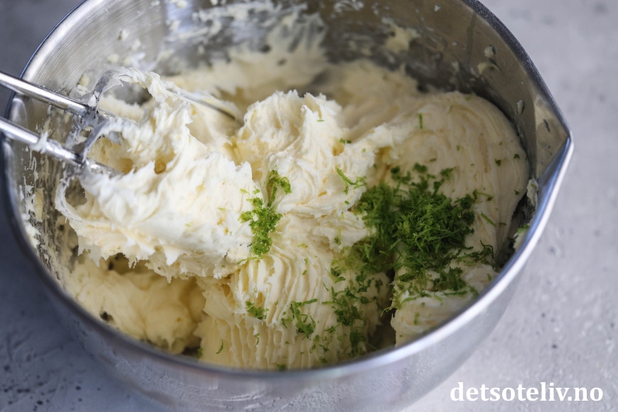 Pisk mykt, romtemperert smør sammen med kremost. Tilsett melis og pisk videre til du får en luftig ostekrem. Bland inn fint revet limeskall.