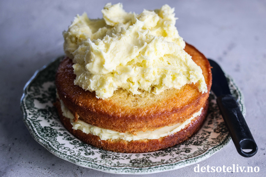 Legg den nederste kakebunnen på et fat. Smør på et tykt lag ostekrem. Legg på den andre kakebunnen og dekk hele kaken med ostekrem.