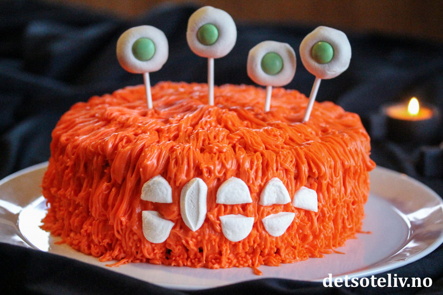 Ostekremen er for anledningen farget oransje og sprøytet på kaken i et hårete mønster. Øynene er laget av hvit marsipan og grønne smarties, og tennene er oppklippede marshmallows.