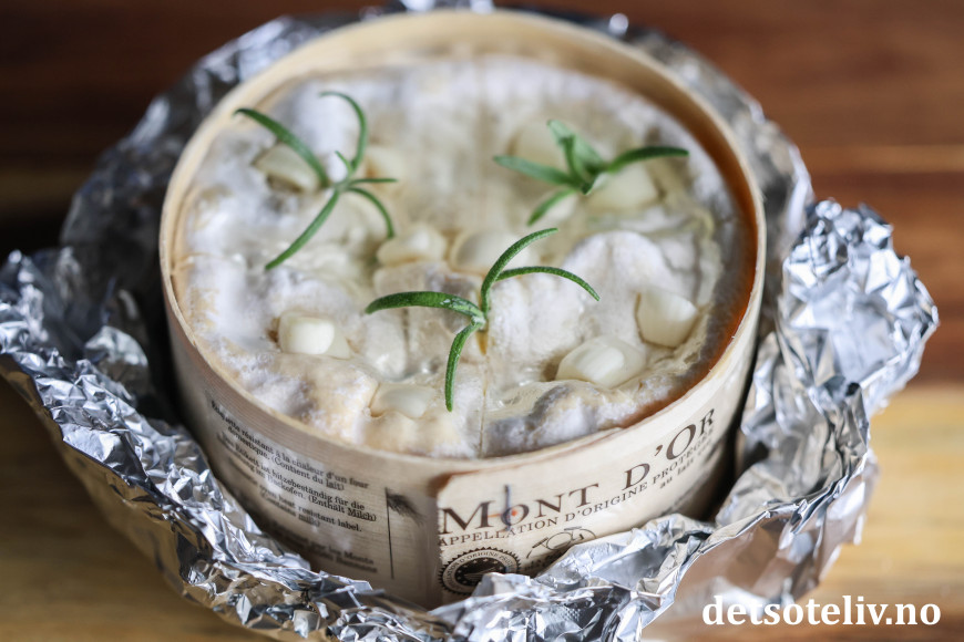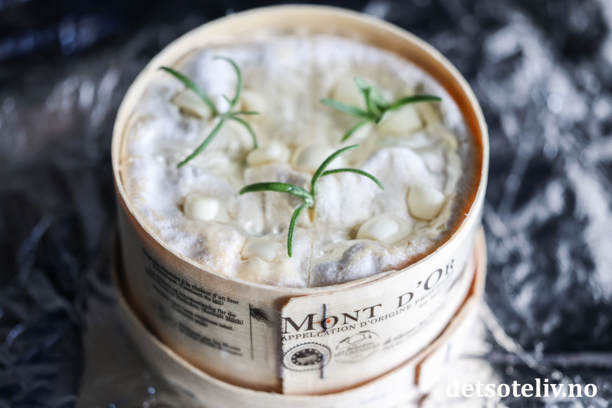 Mont d'Or er nydelig som den er, men kan også piffes opp med ekstra smakstilsetninger. En veldig tradisjonell måte er å ovnsbake osten med rosmarin, hvitløk og hvitvin som jeg har gjort her. Hvitløksbitene kan fjernes før servering, eller serveres sammen med den rennende osten. Rosmarin kan erstattes med frisk timian. En annen luksus-variant er å høvle masse sort trøffel over osten før servering. Mont d'Or kan også smaksettes i søtlig retning med for eksempel honning, nøtter og litt konjakk. Honning og hvitløk er også en herlig kombinasjon. Mulighetene er mange med en så fantastisk god ost! 😋