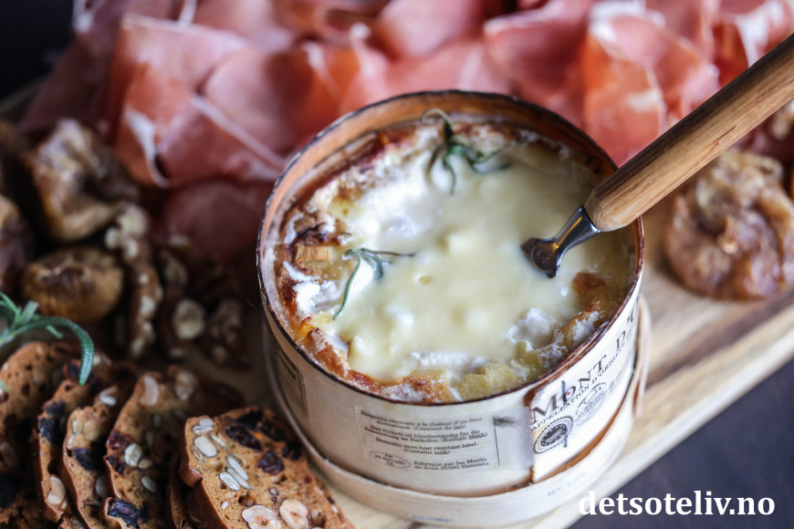 ♥ SØT VARIANT: Mont d'Or er også godt med søtt tilbehør, som nøtter og tørket frukt, honning og fikenmarmelade og fruktbrød. Du kan da erstatte hvitløk, rosmarin og hvitvin på toppen av osten med litt honning og et par skjeer konjakk før steking.