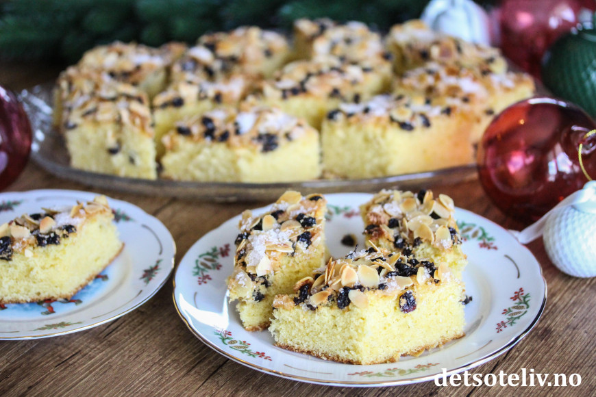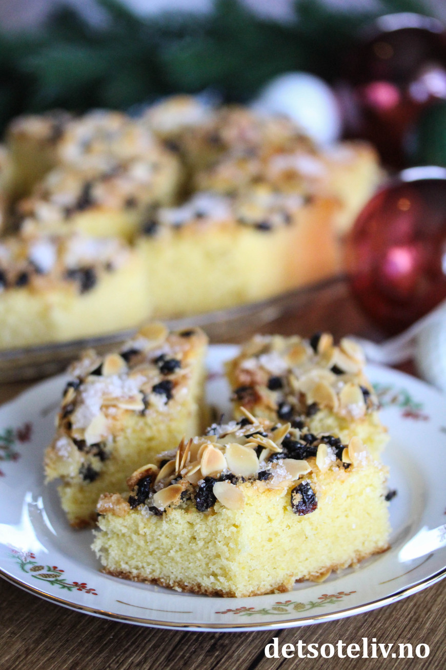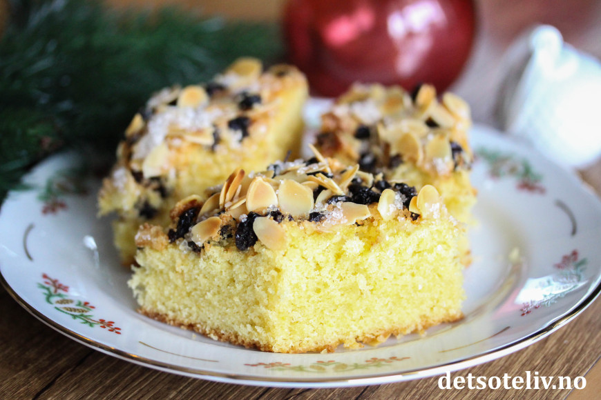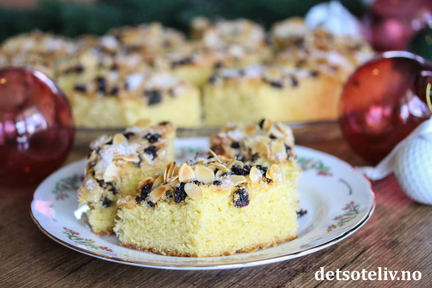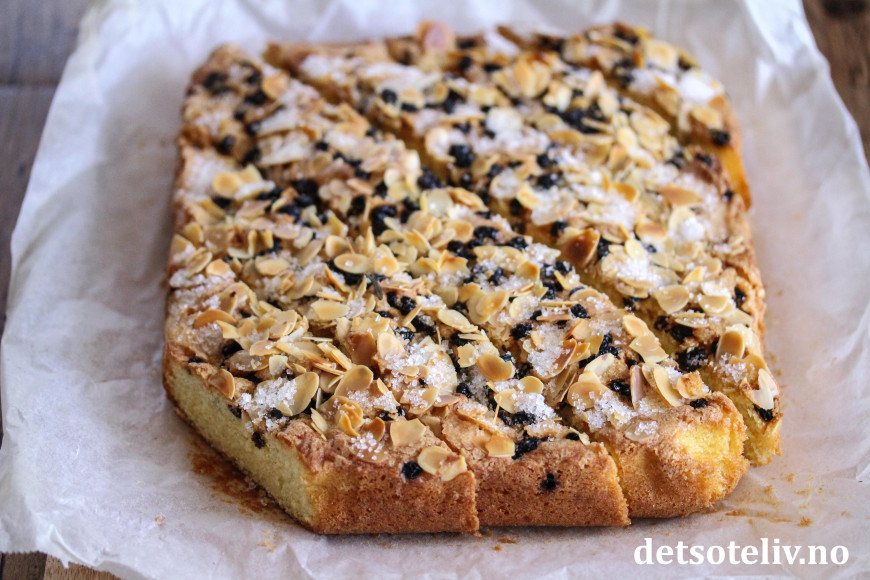 Fordel deigen utover i en liten, bakepapirkledd langpanne (ca. 20 x 30 cm). Strø over korinter, lett knuste mandelflak og perlesukker.