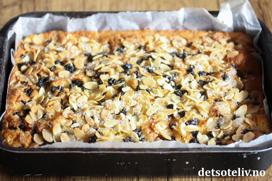 Strø over korinter, mandelflak og perlesukker.