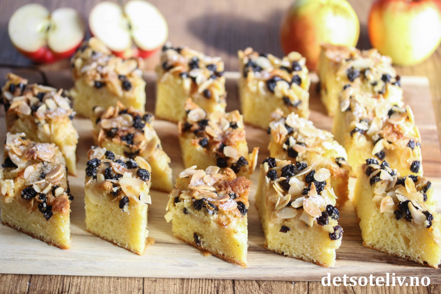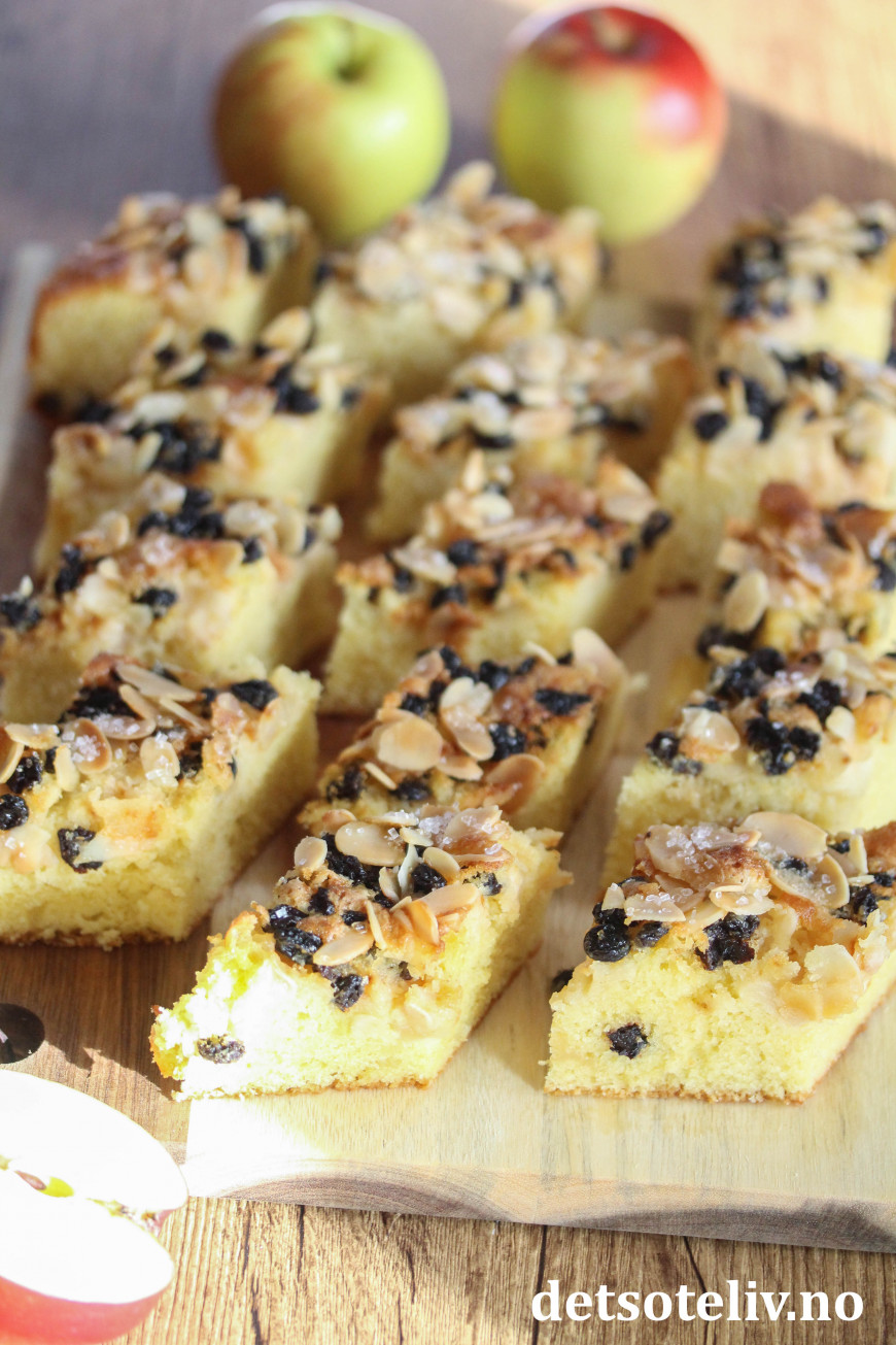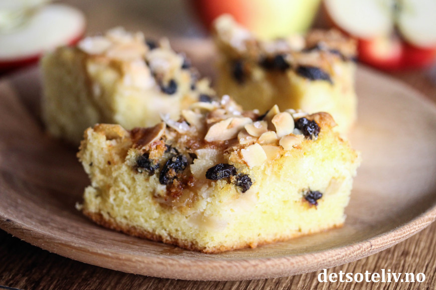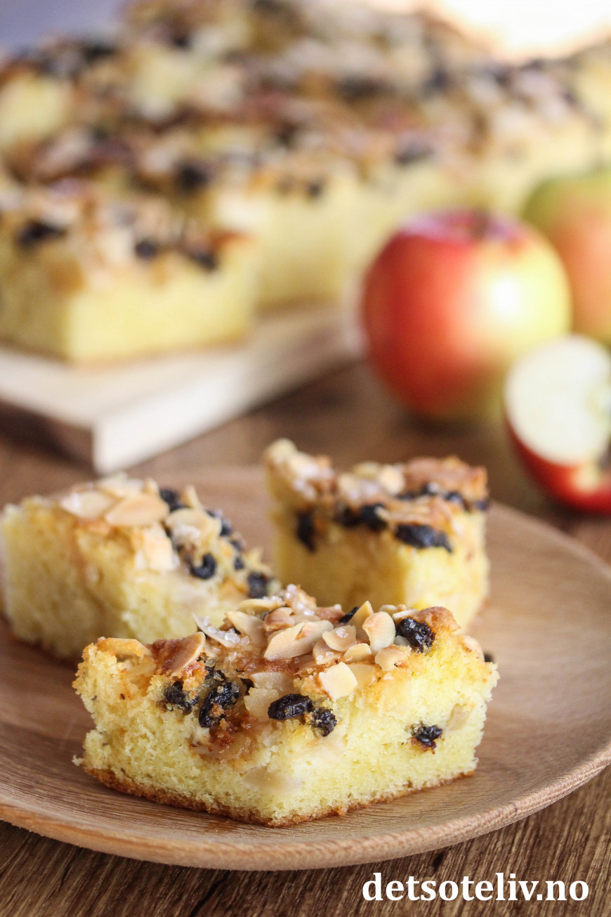 Til en forandring blir dette en eplekake uten kanelsmak. I stedet kommer smaken av korinter, mandler og litt sitron godt frem sammen med eplesmaken.