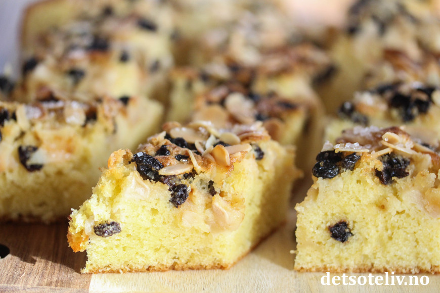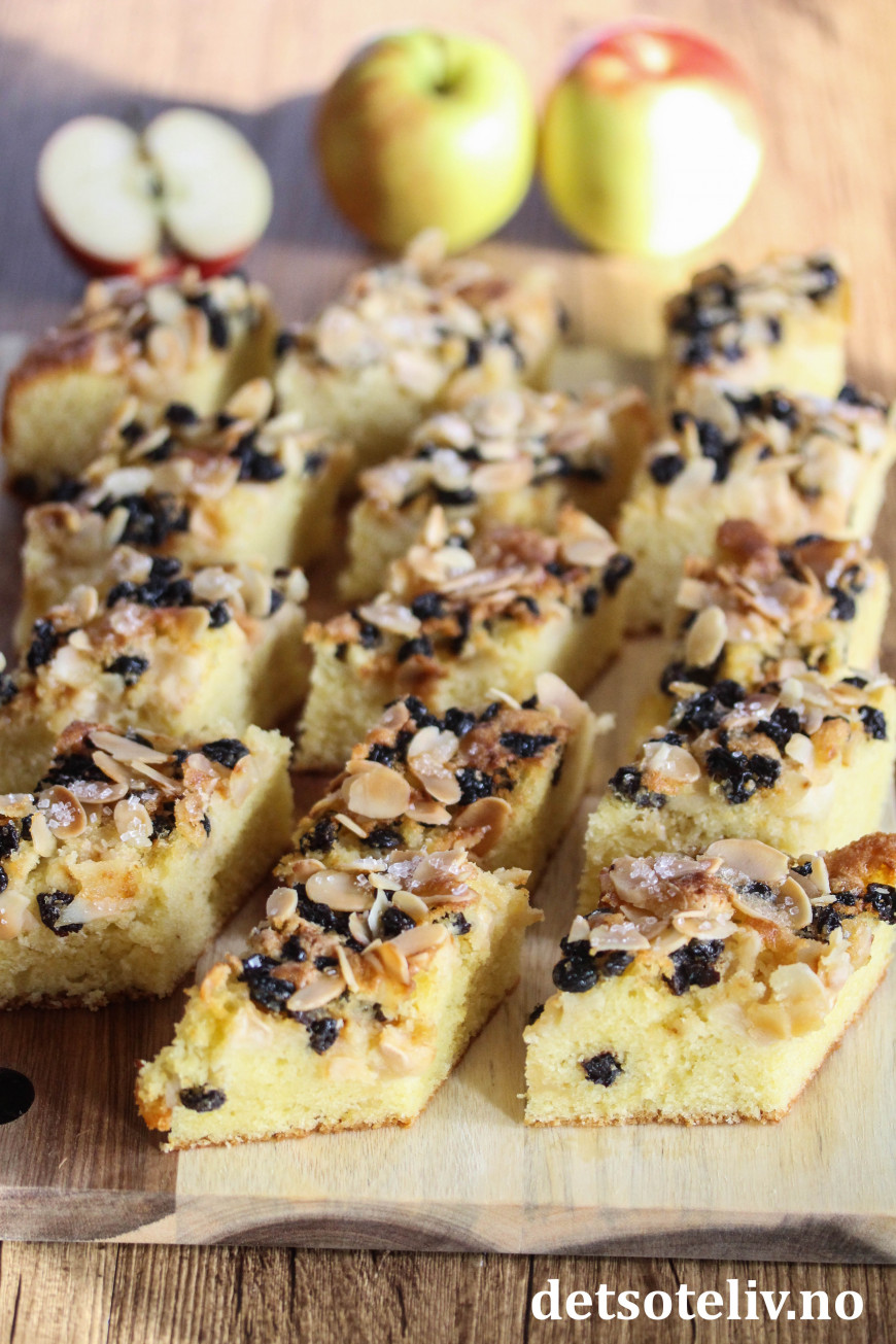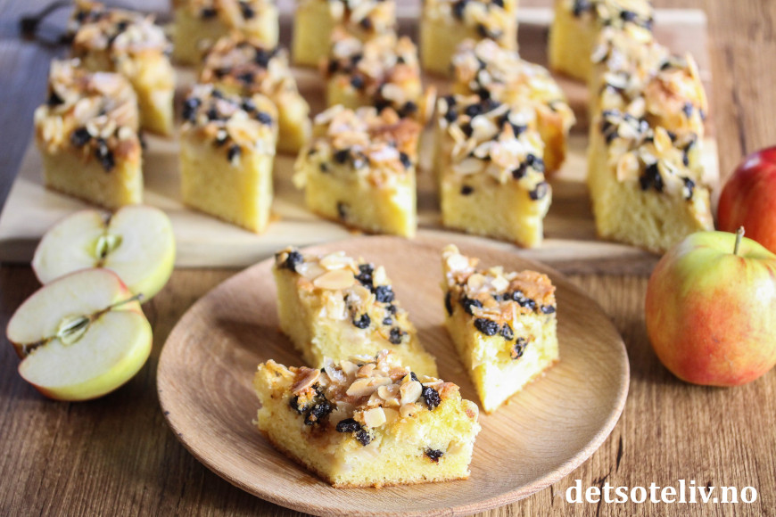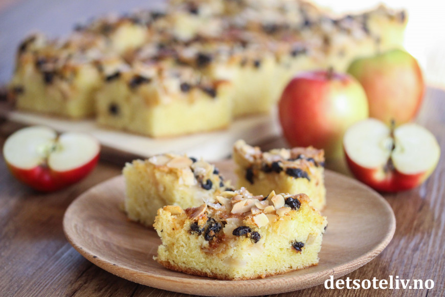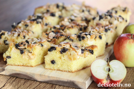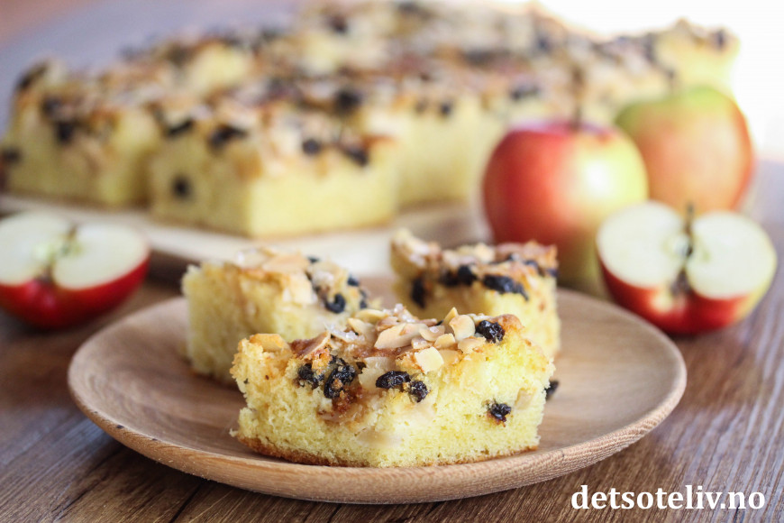 Til en forandring blir dette en eplekake uten kanelsmak. I stedet kommer smaken av korinter, mandler og litt sitron godt frem sammen med eplesmaken.