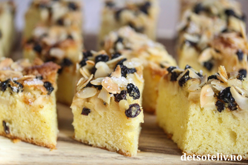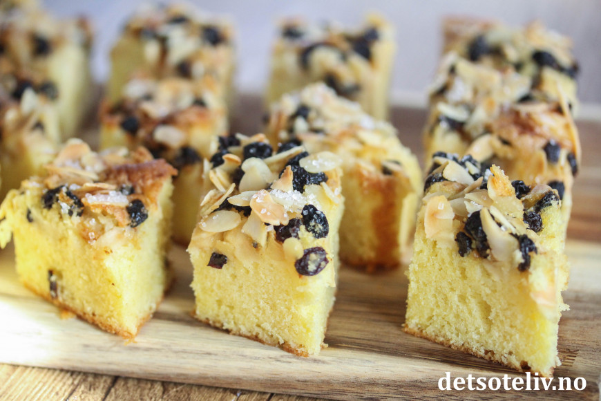 Løft kaken ut av formen og del kaken opp i snitter eller i firkanter.