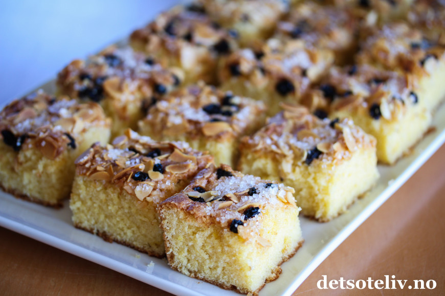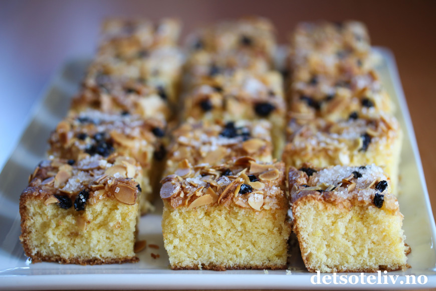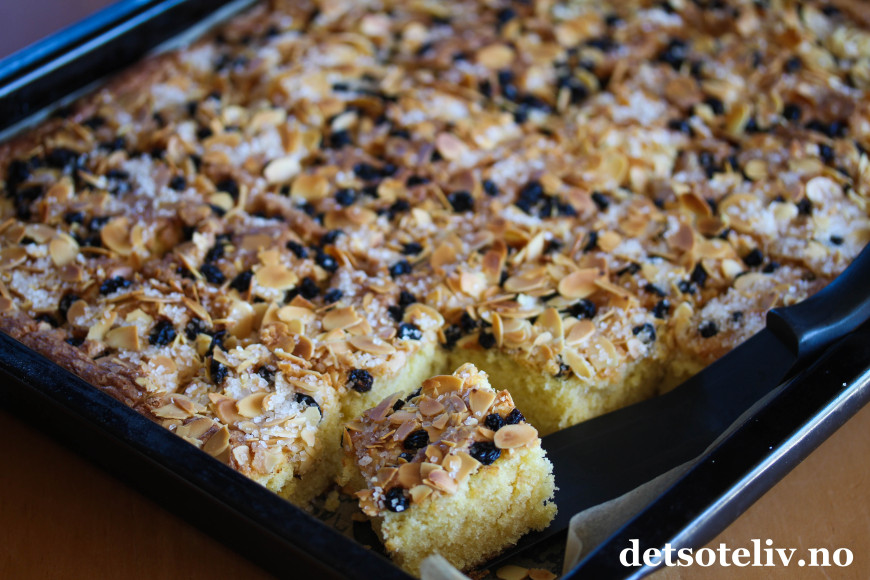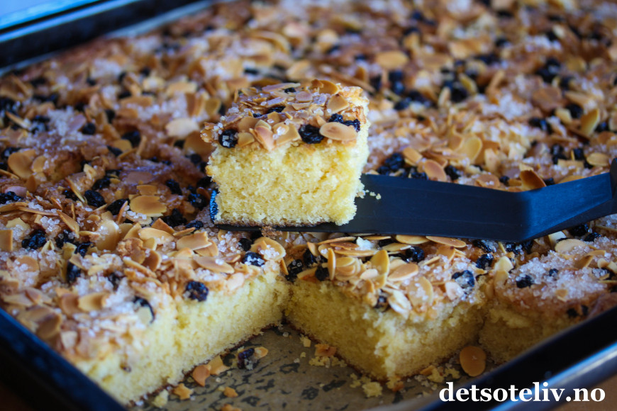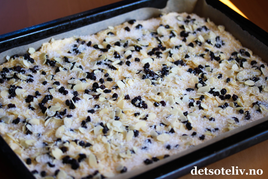Fordel deigen utover i en store, bakepapirkledd langpanne (ca. 30 x 40 cm). Strø over korinter, lett knuste mandelflak og perlesukker.