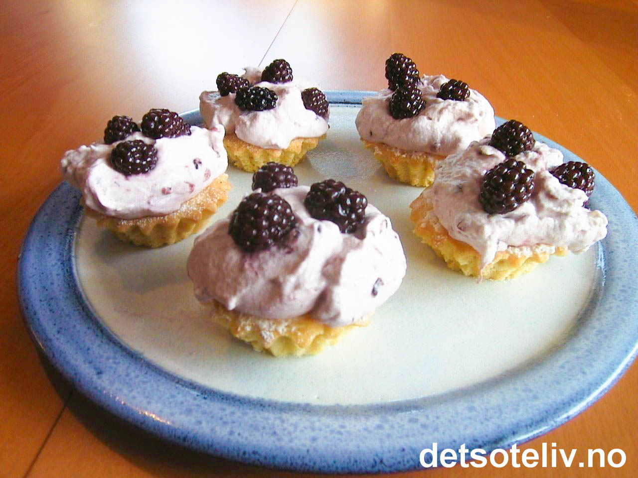 Fyll kakene før servering med pisket krem som er smaksatt med bjørnebærsyltetøy. Pynt med godt avrente hermetiske bjørnebær.