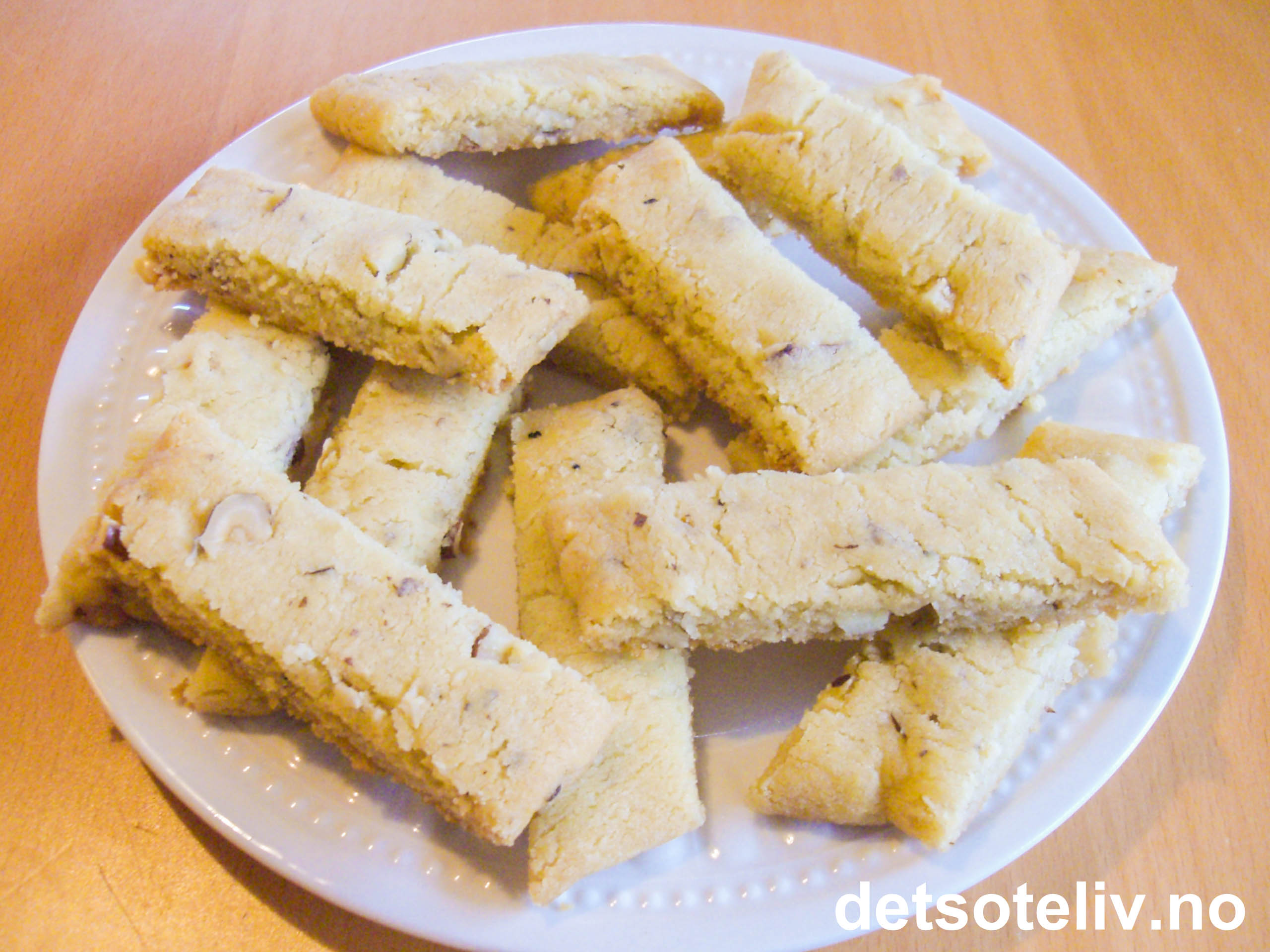Stekes i ovnen på midterste rille ved 200°C i 7-10 min, eller til lengdene har flytet ut og er lys gyldne. Avkjøl i et par minutter. Skjær lengdene opp på skrå med en skarp kniv mens de fortsatt er varme. La kakene avkjøles en liten stund til på stekeplaten før de forsiktig flyttes over på en rist og avkjøles helt (se tips).