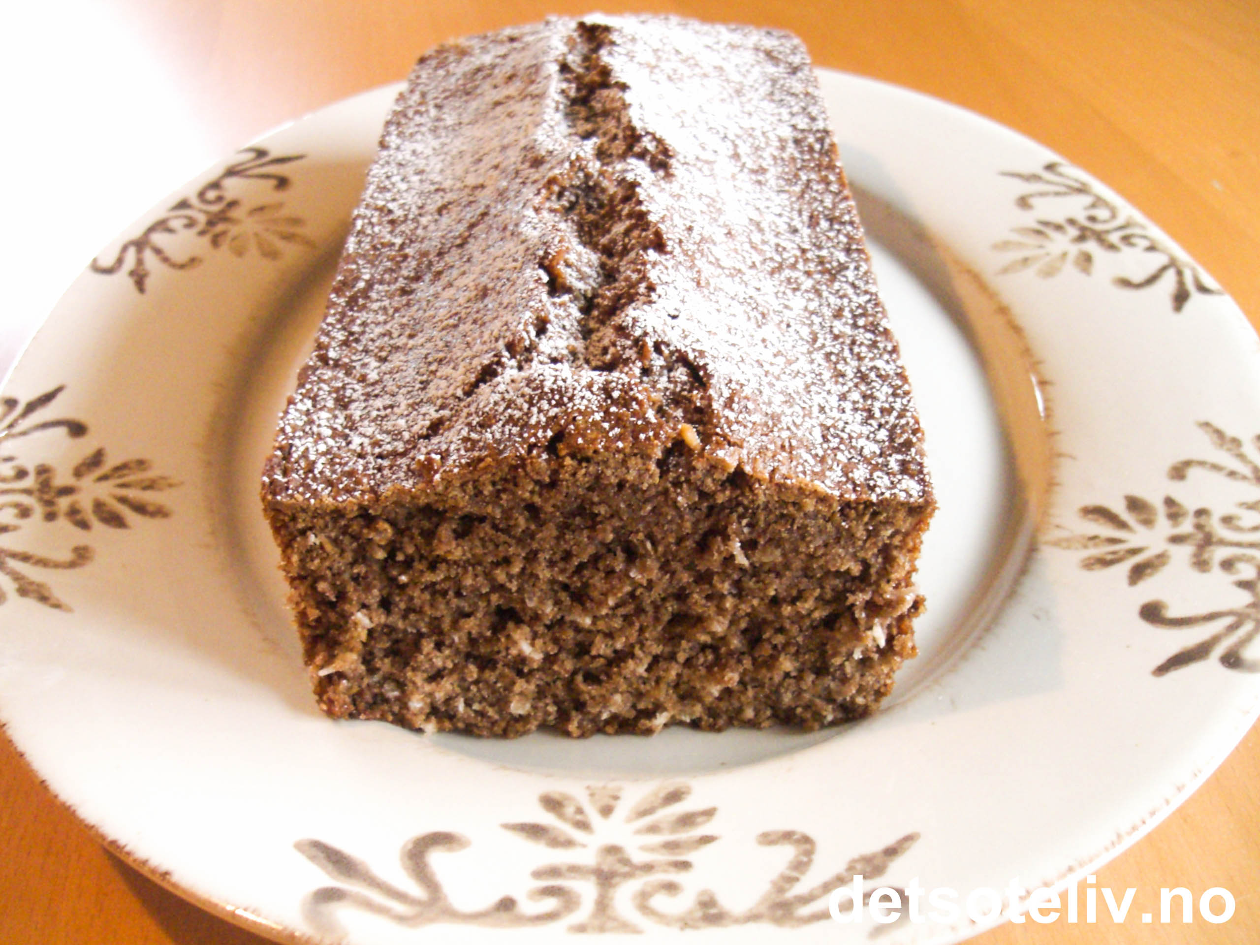 Avkjøl kaken litt før den forsiktig løsnes fra formen og hvelves ut. Fjern bakepapiret og sett kaken på et passende fat. Sikt over melis før servering.
