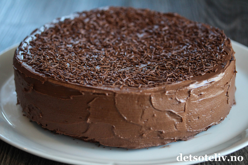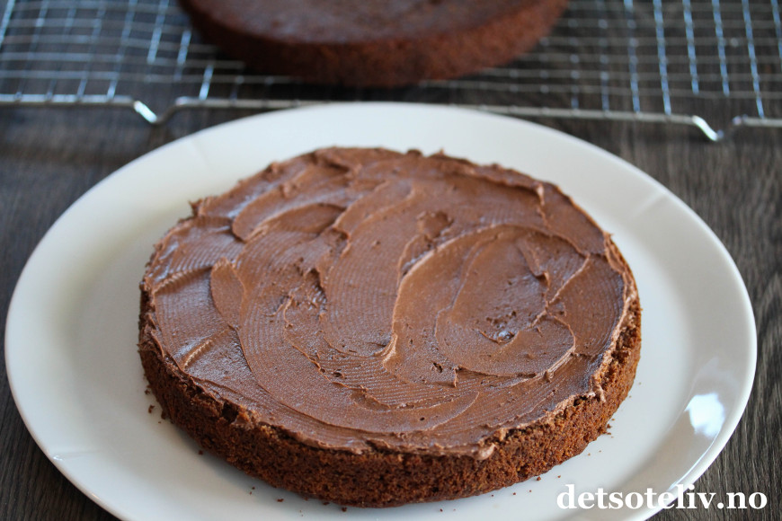 Fordel sjokoladekremen mellom kakebunnen og deretter rundt hele kaken.