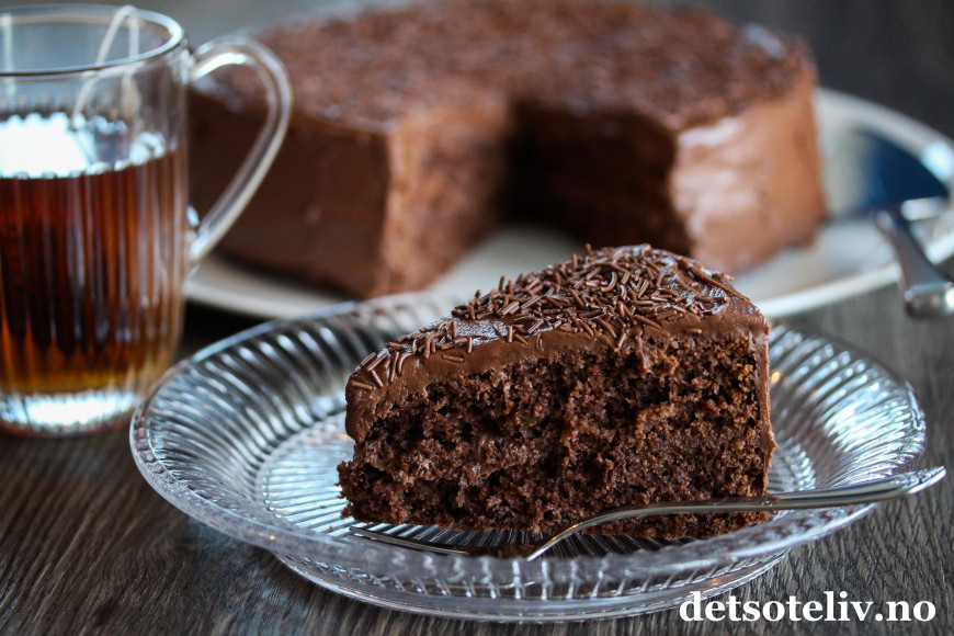 Del kakebunnen i to eller tre bunner. Fordel sjokoladekremen mellom kakebunnen og deretter rundt hele kaken.